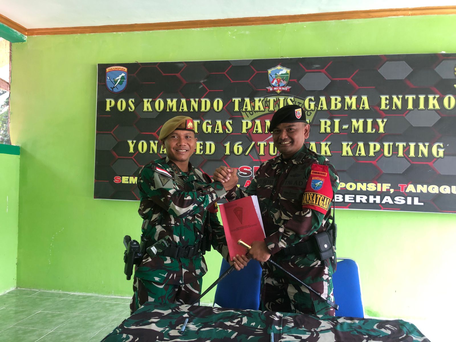 Dalam kesempatan serah terima ini dilaksanakan penandatanganan buku memorandum serah terima dari Dansatgas lama kepada Dansatgas baru.